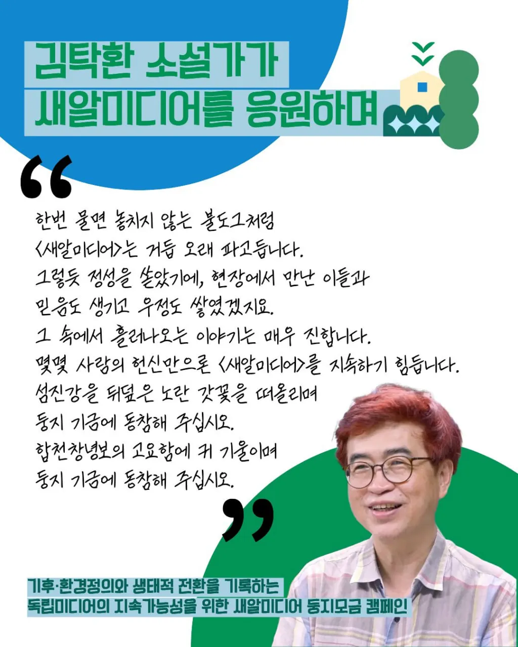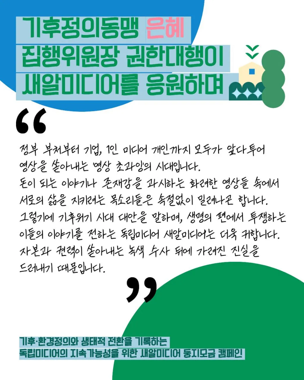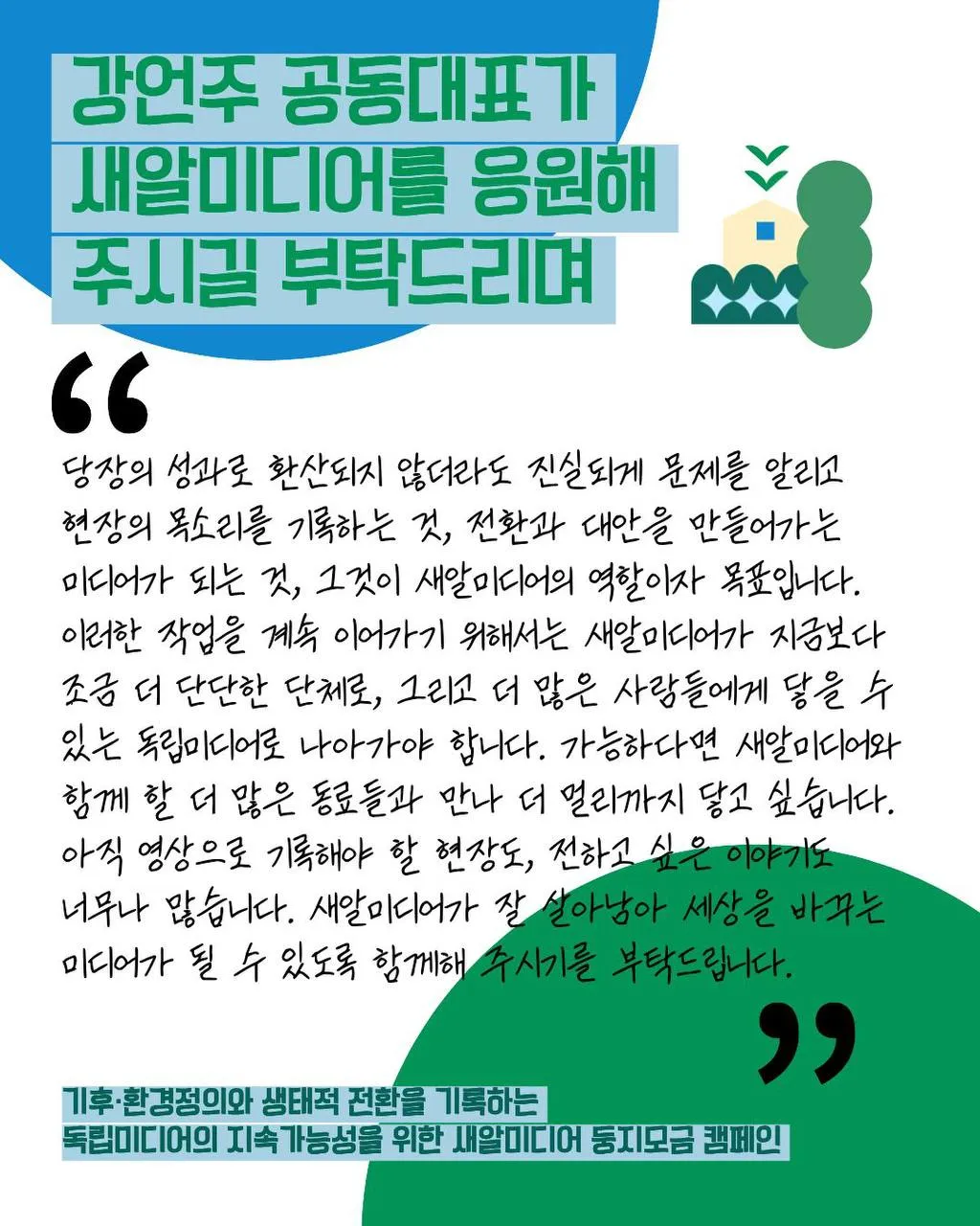 ”여러분들이 새알미디어에 후원을 하신다면 기후정의를 위한 체제전환의 밑거름이 될 것입니다! 새알미디어 화이팅“